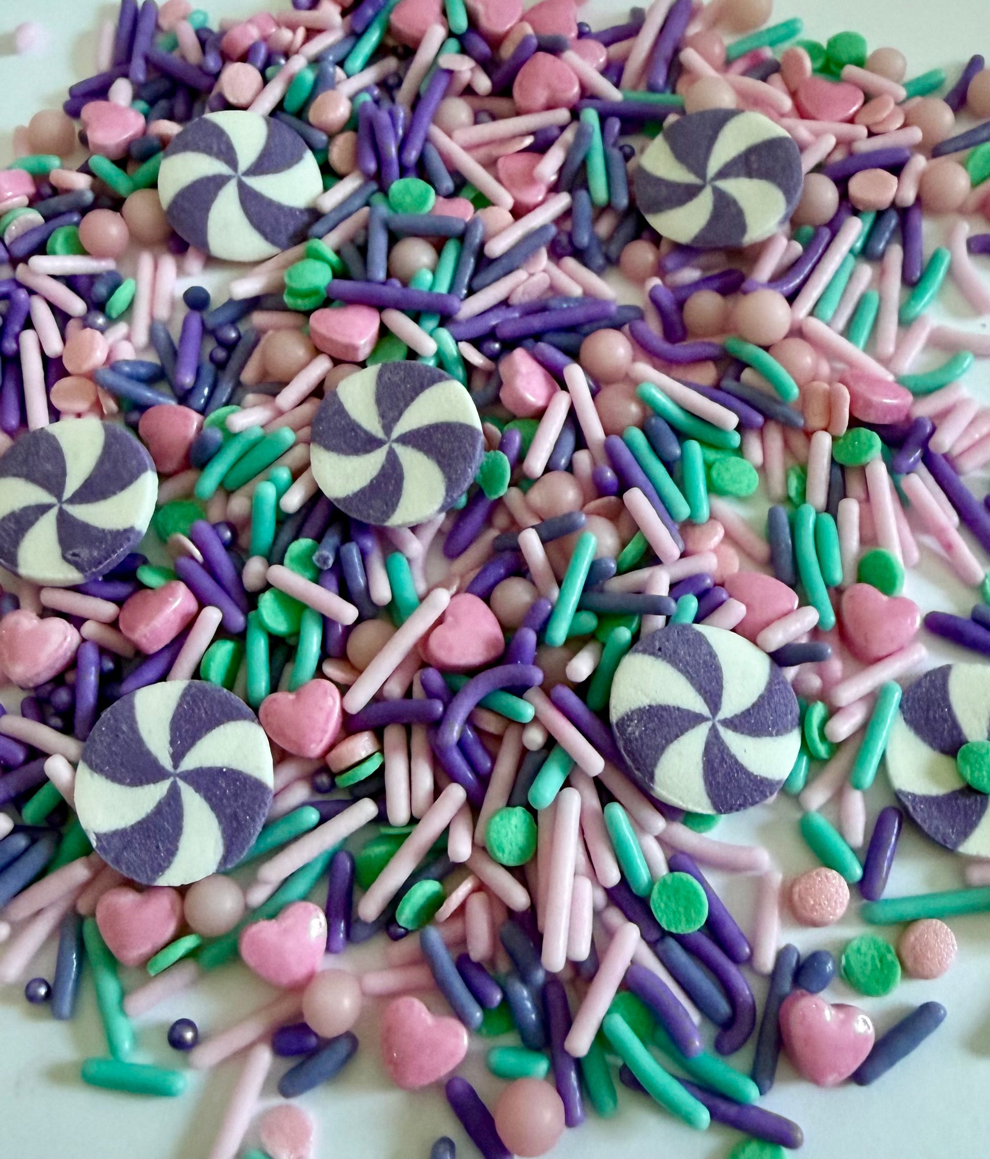 Celebrate Valentine's in the sweetest way with our Be Mine sprinkle mix! This medley includes purple swirl fondant slices, pink candy beads, pink mini hearts, nonpareils, jimmies, and more!